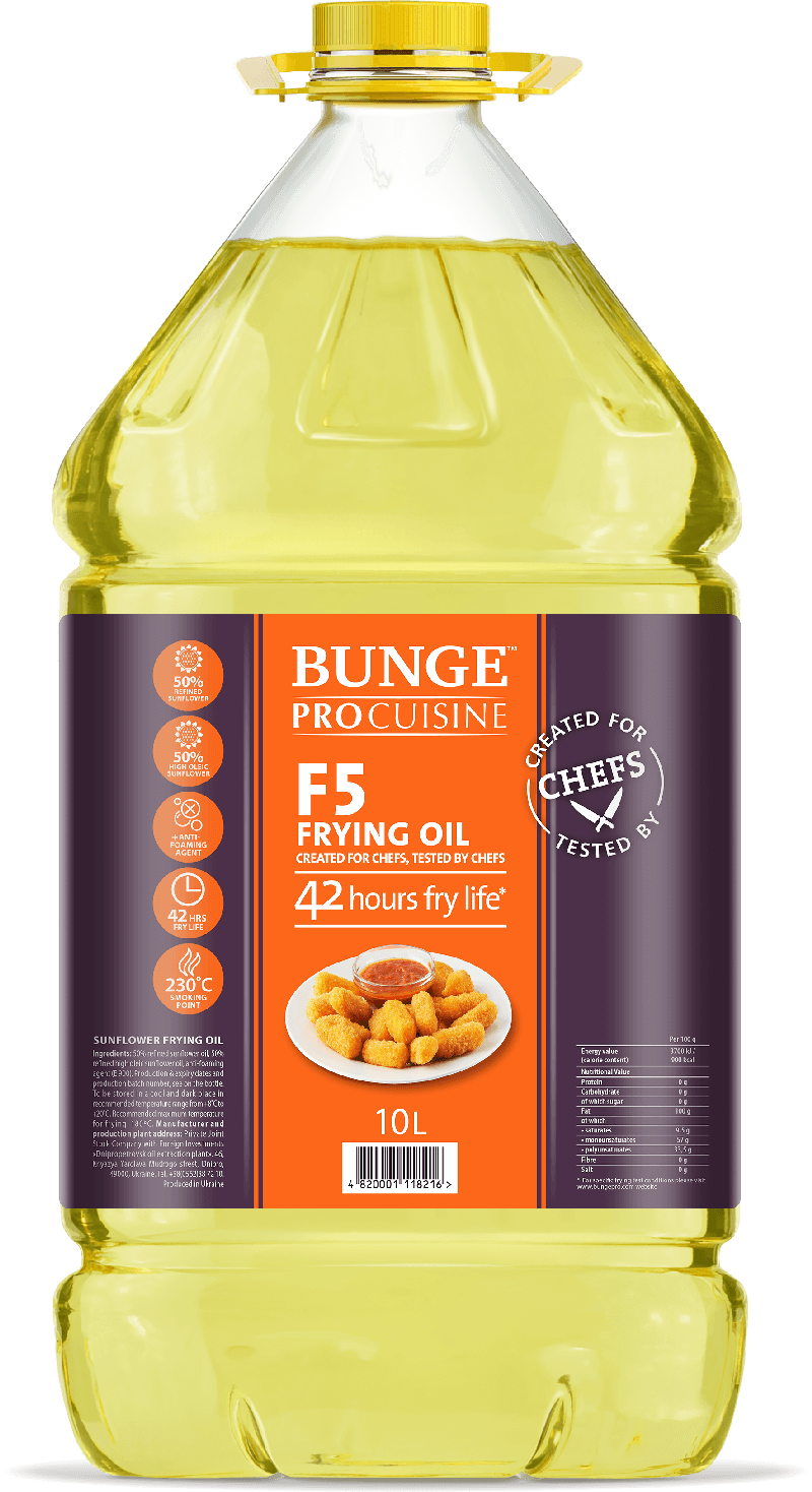 BUNGE ProCuisine F5 products are safe and of high quality for up to 42 hours of frying, on average 6 hours of frying for 7 days, subject to the conditions described above.